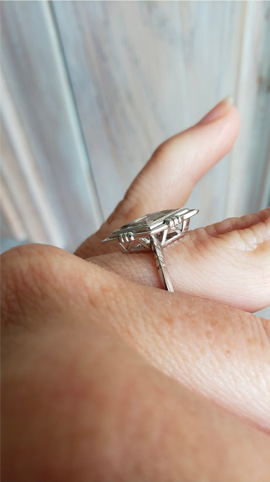 Stunning modern Art Nouveau Inspired ring with unique 1.6ct kite cut stone. Sleek knife-edge setting, conflict-free. Bold, contemporary yet vintage design for the trendsetter.