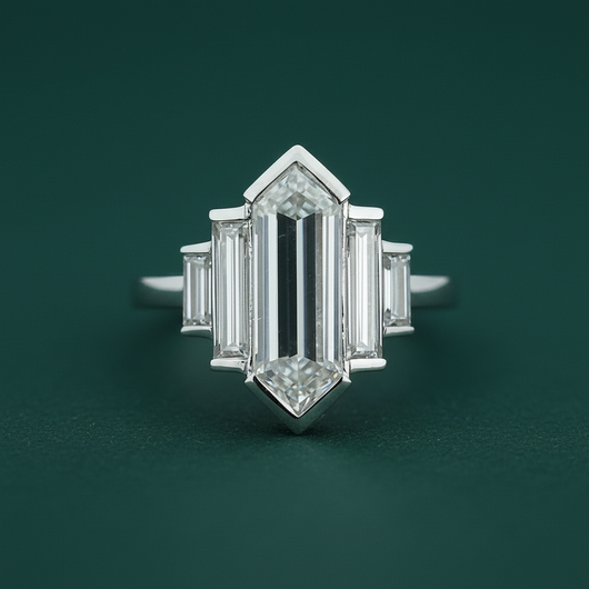 This design features an Art Deco style setting. Set with a 1.1 carat Custom Cut Elongated Hexagon center stone and and .35 Carats of Custom Cut Baguettes.  Available in Lab diamond and Moissanite