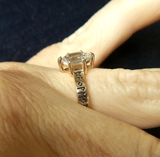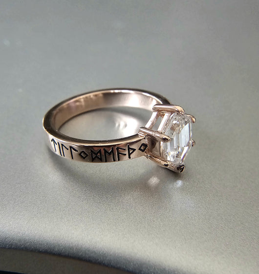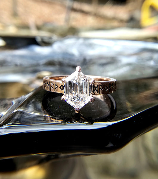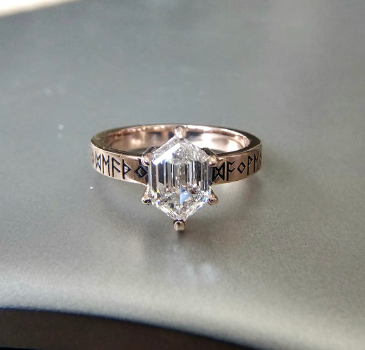 The Frigg Ring | Elongated Hexagon Diamond Engagement Ring | Hand-Engraved Norse Runes in 14k Rose Gold | Alternative Viking Bridal & Pagan Wedding Band | PenelliBelle