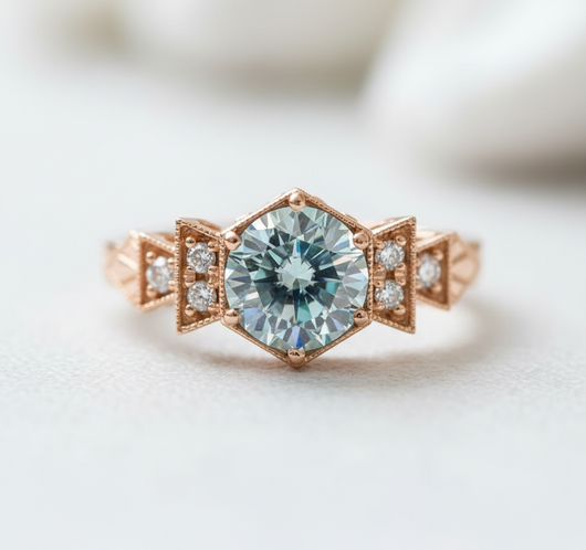 This stunning design features an Art Deco Style 14k Rose Gold setting.  Set with a center 7mm 1.2 carat Ice Blue moissanite or Blue Lab Diamond and with .24 Carats of Moissanites or Diamonds.