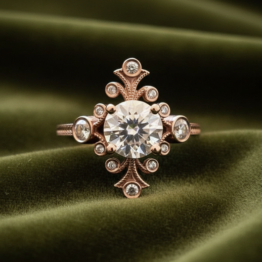 Etched Antique Art Nouveau Style setting with 1 carat center and .30 carats of Accent Stones.