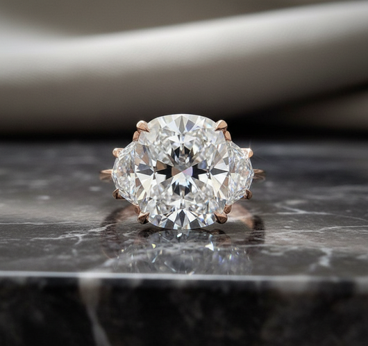 This ring features a Modern luxurious setting. Set with a 4 carat center Cushion cut Stone and .60 carats each of custom Pentagon Cut Stones.